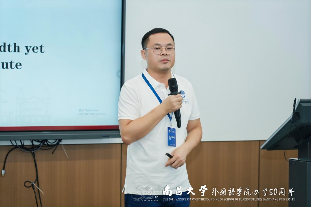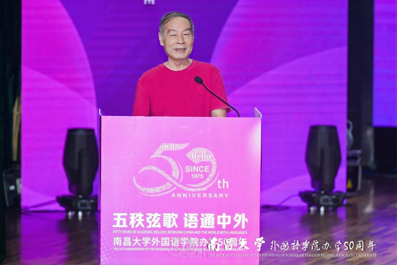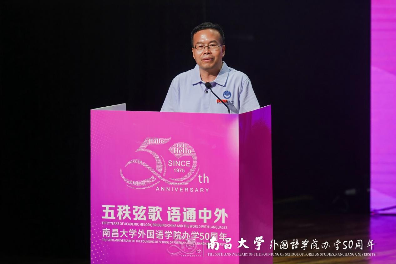 外国语学院院长陈夜雨教授在典礼上致辞。他深情回顾了学院自1975年创办以来的发展历程与办学成就,向为学院建设倾注心血的前辈先贤、历任领导以及全体教职工致以崇高敬意与衷心感谢,特别深切缅怀了刘平、徐崇亮、罗志野等大先生为学院创立与发展所奉献的毕生心力,并向从五湖四海奔赴归来的校友们表示热烈欢迎。他指出,面向未来,学院将以“申博攻坚”为新起点推动学科建设,深耕“外语+涉外法治”等学科交叉专业人才培养,打造区域国别研究学术高地,深化“AI+外语教育”创新改革,主动服务江西高水平对外开放,在践行“德业兼修”初心中更好融入国家战略与地方发展。