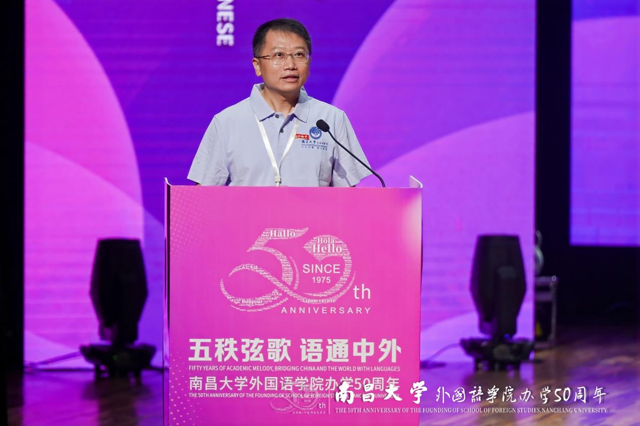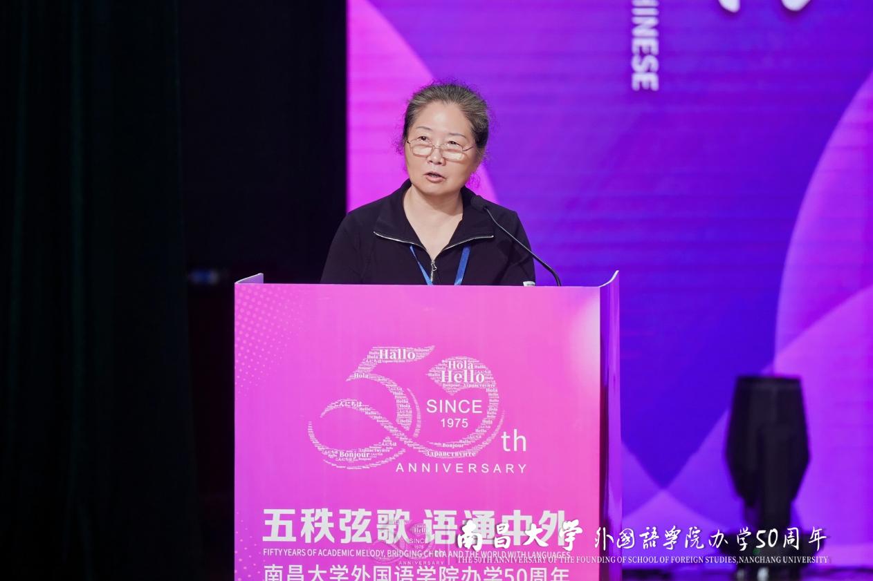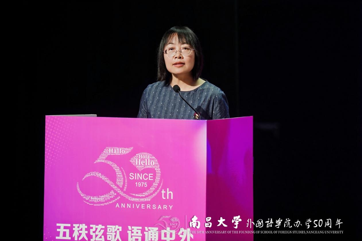 南昌大学党委常委、副校长平卫英教授致辞,充分肯定学院五十年来在人才培养、学科建设和服务国家和区域发展等方面取得的显著成就,希望学院继续肩负“语通中外、讲好中国故事、传播好中国声音”的时代使命,培养“有根底、会创新、有温度”的高层次外语人才。