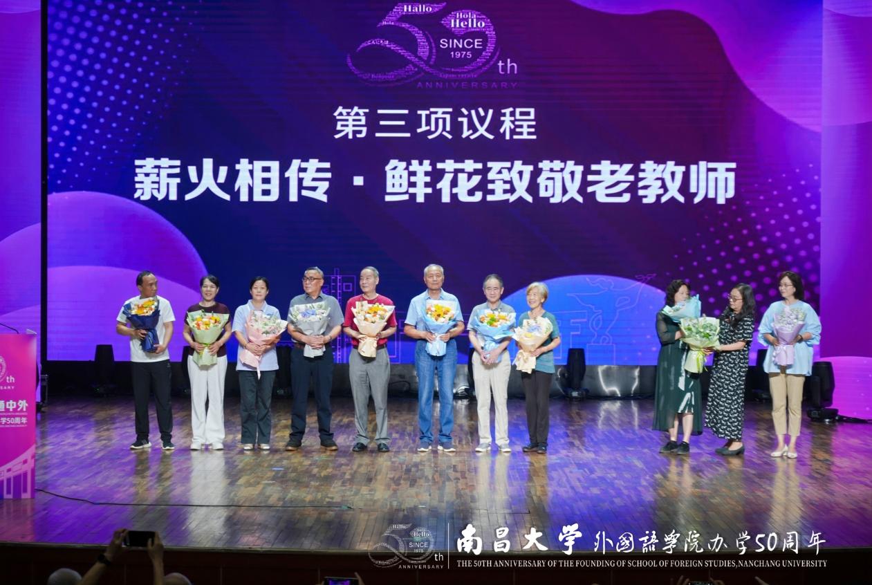 与会人员共同观看了学院五十周年发展历程专题片,回顾了学院“以语言为桥,连世界、育新人”的奋斗征程。学生代表向赵国杰、许健健、刘迪驎、左维远、陈其昌、方克平、吴丽敏、蒋平、陈辉、姚倩、周敏、李苏等十二位躬耕教坛的老教师代表献上鲜花,表达对师者的崇高敬意。